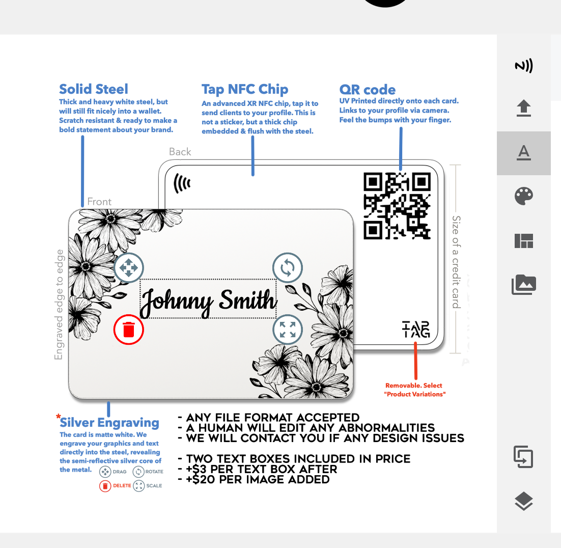 Customize your own tap card to represent you or your business. Choose an item below, click into the product, then add it to cart to open our Canva-like personalizer. Add your own graphics and text then adjust to your liking. All custom items are shipped the next business day.