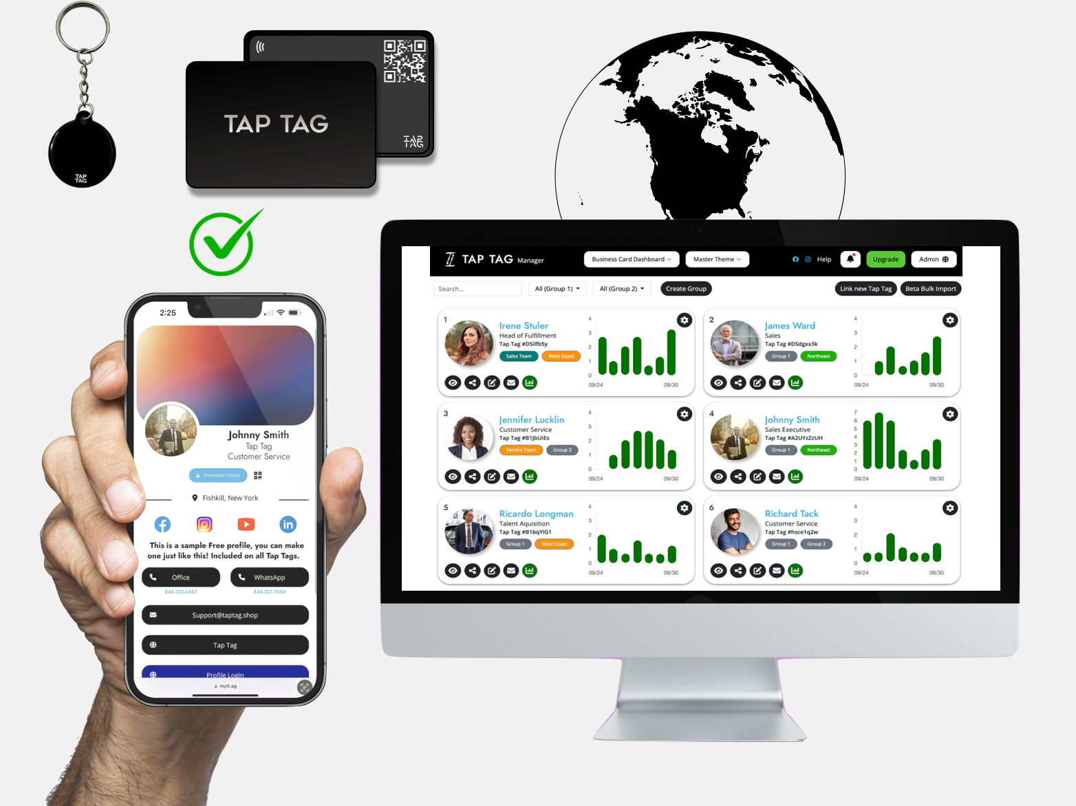All Tap Tags can direct to your digital business card, contact, or to any website. Change any time for your free dashboard. Link multiple Tap Tags together to manage a team.