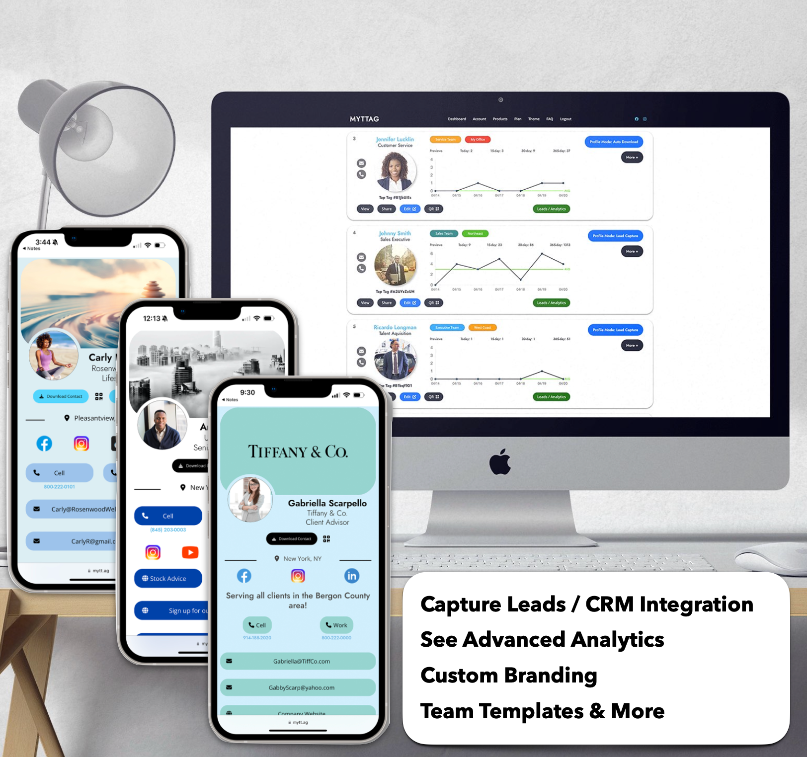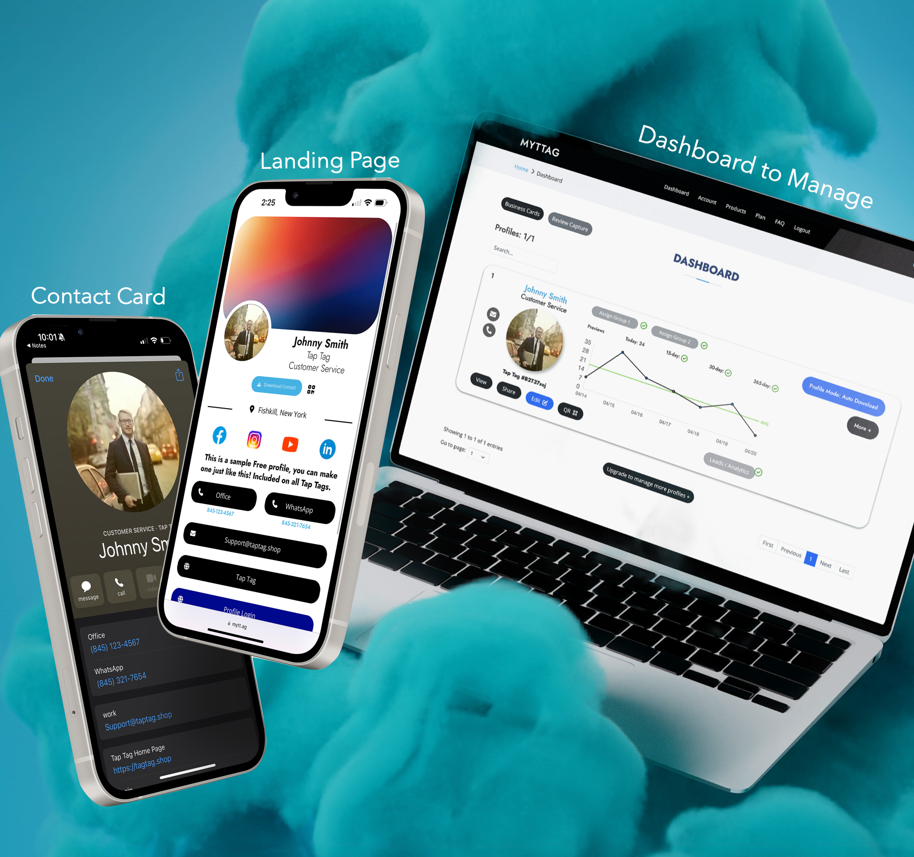 An advanced dashboard to setup and manage your digital business card. Edit your contact information, design your own landing page, download your QR code, and do it from any device. Email your profile, text it, or share it with one of our Tap business cards. Optional upgrades available.
