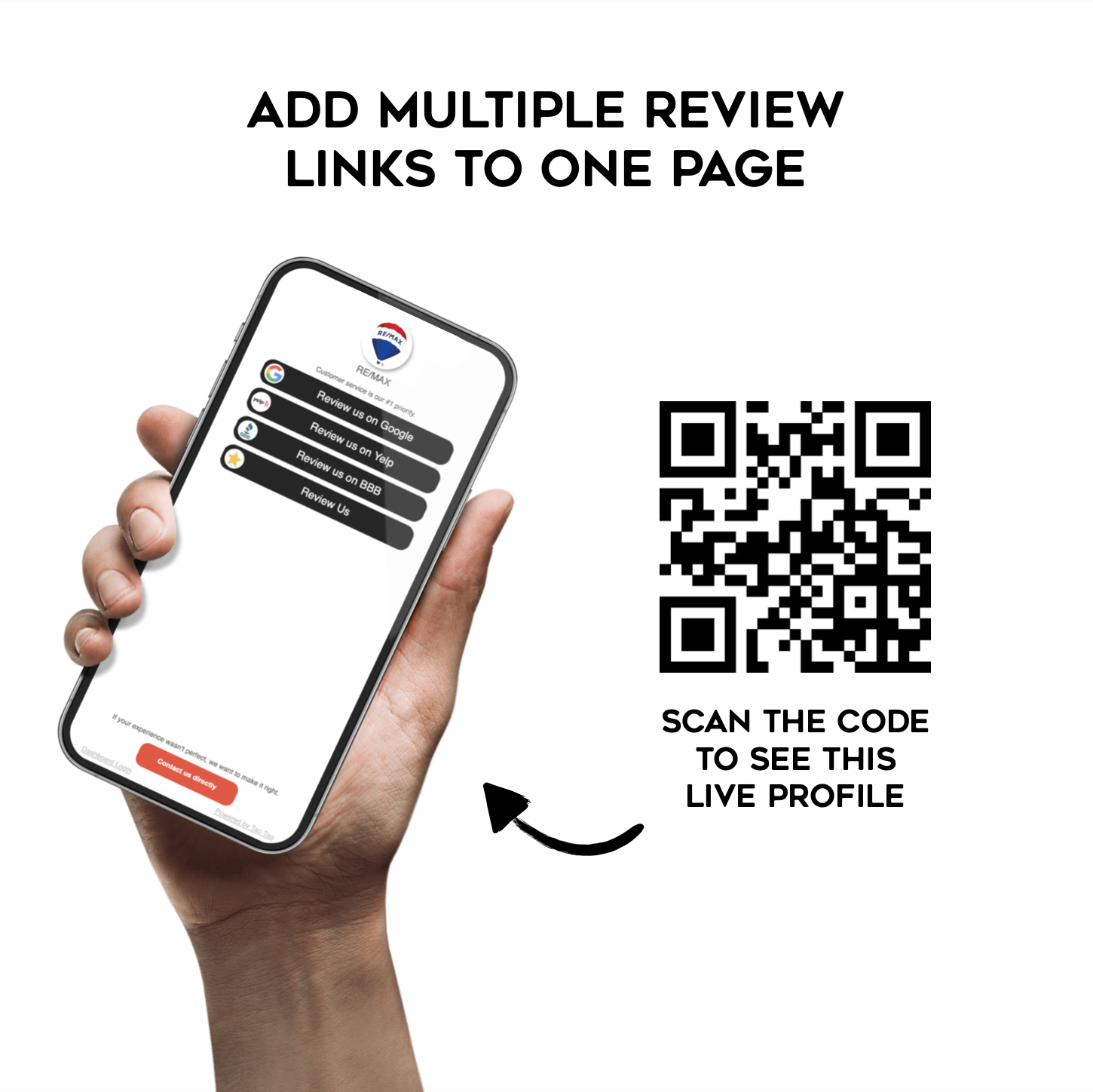 Click to see this profile in actionAdd multiple review links on a single page. Feature links to Google, Trustpilot, Tripadvisor, Yelp, or any other review site. Give your client the option to choose where to leave a review and possibly get multiple reviews from one client.