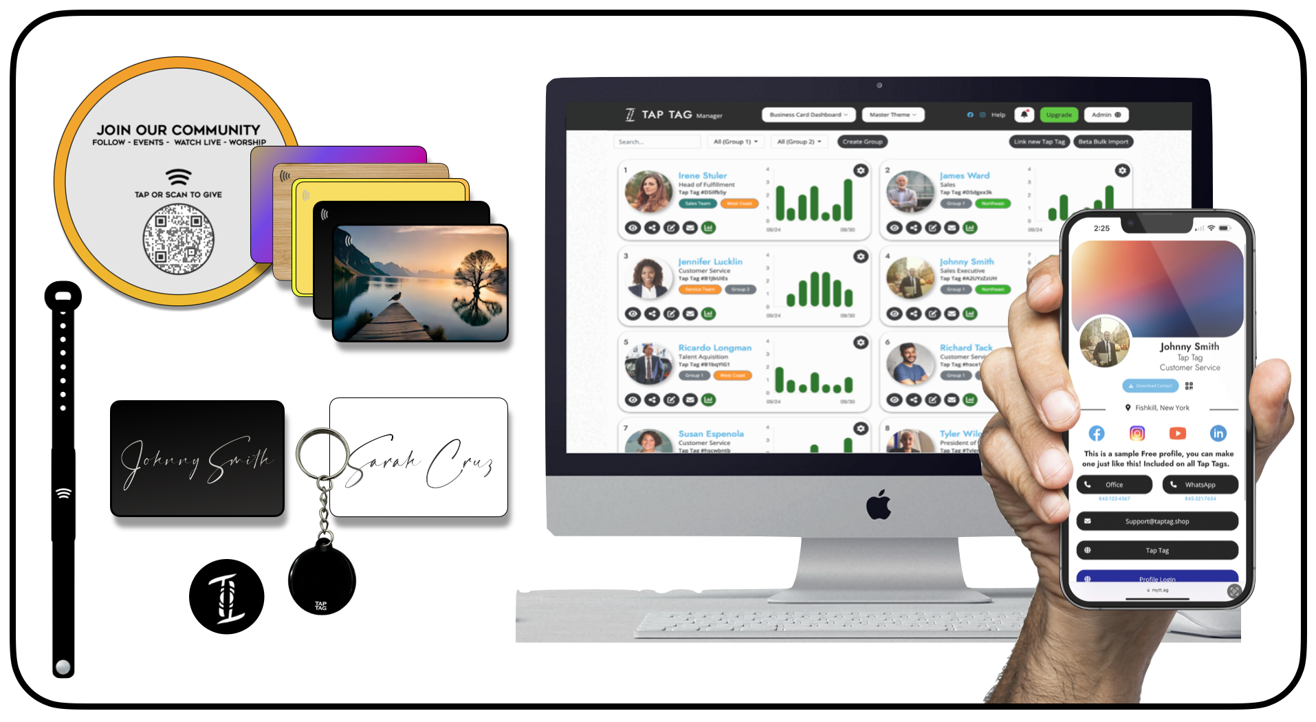 Firstly, we sell physical products with NFC tap technology. When you hold our items to a smartphone (by tapping to it) they transfer data wirelessly. This tap sharing technology is in 95% of our products (anything that says "tap" in its description like a tap card, tap keychains, tap bracelet, or tap sign).