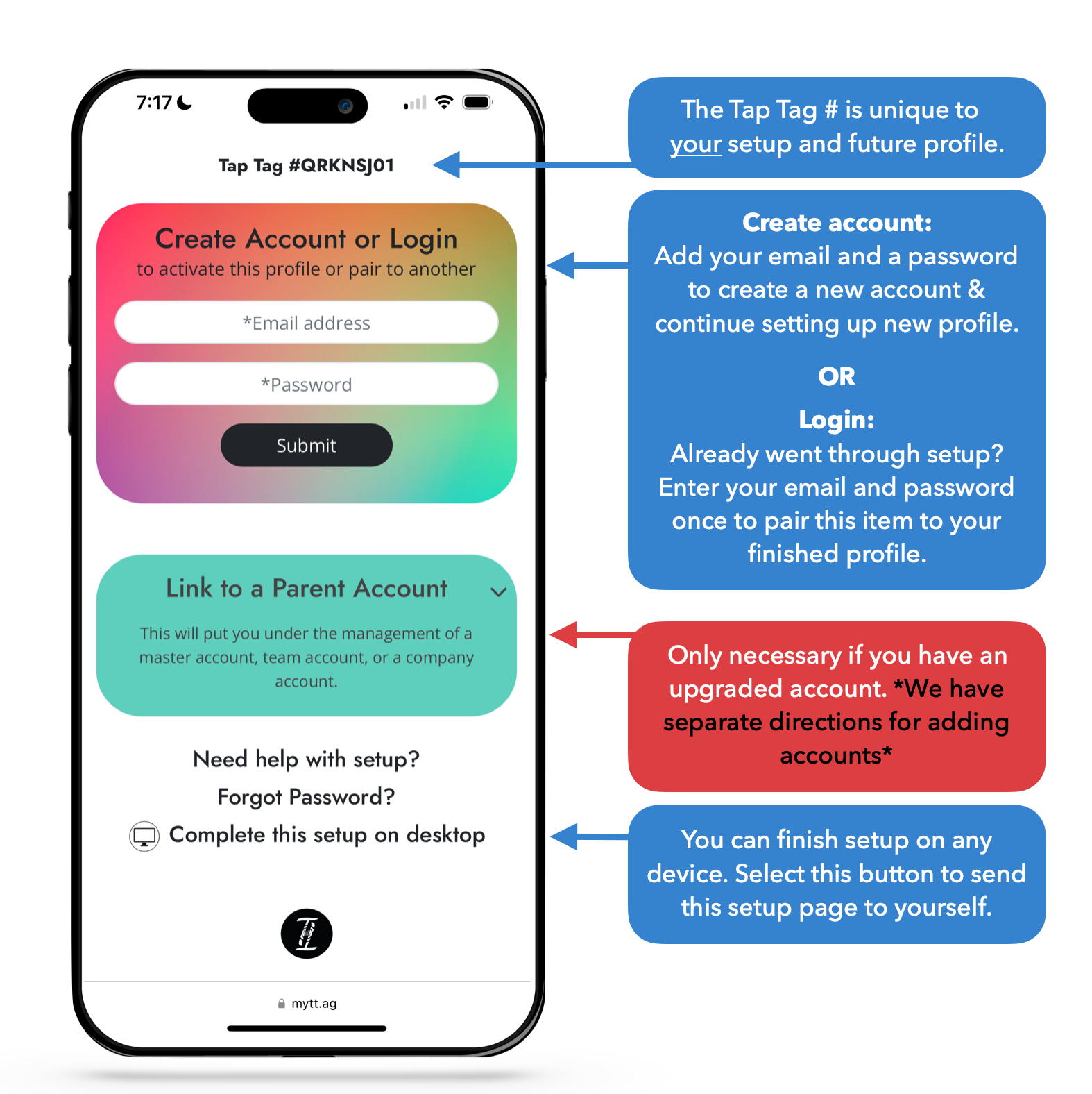 This may require an upgraded package. Enter Tap Tag setup mode by scanning a new item, select the second option to "link to parent account"