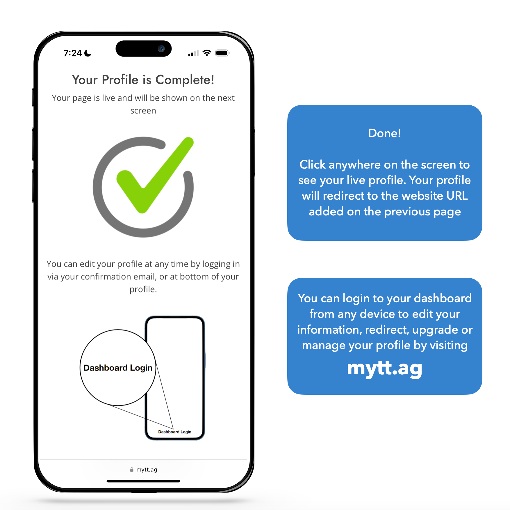 After creating your first profile, you can login from any device to edit your information. Any edits will affect your Tap Tag(s) remotely in real time. It will also affect any printed QRs, links, or items associated with your edited profile.
