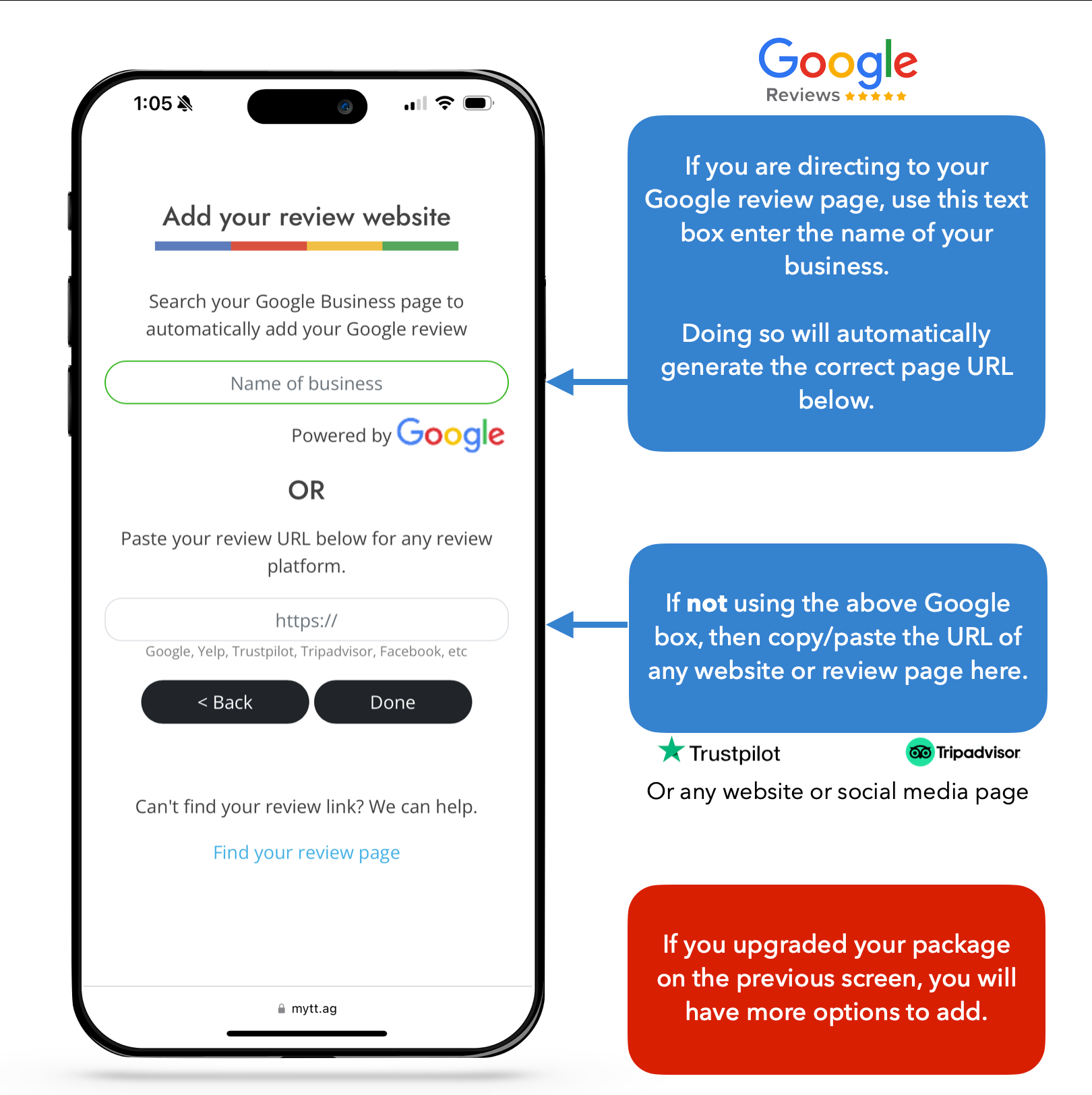 We integrate directly with Google, so if you want to add your Google review page type the name of your business into the first box and select the correct location from the dropdown.