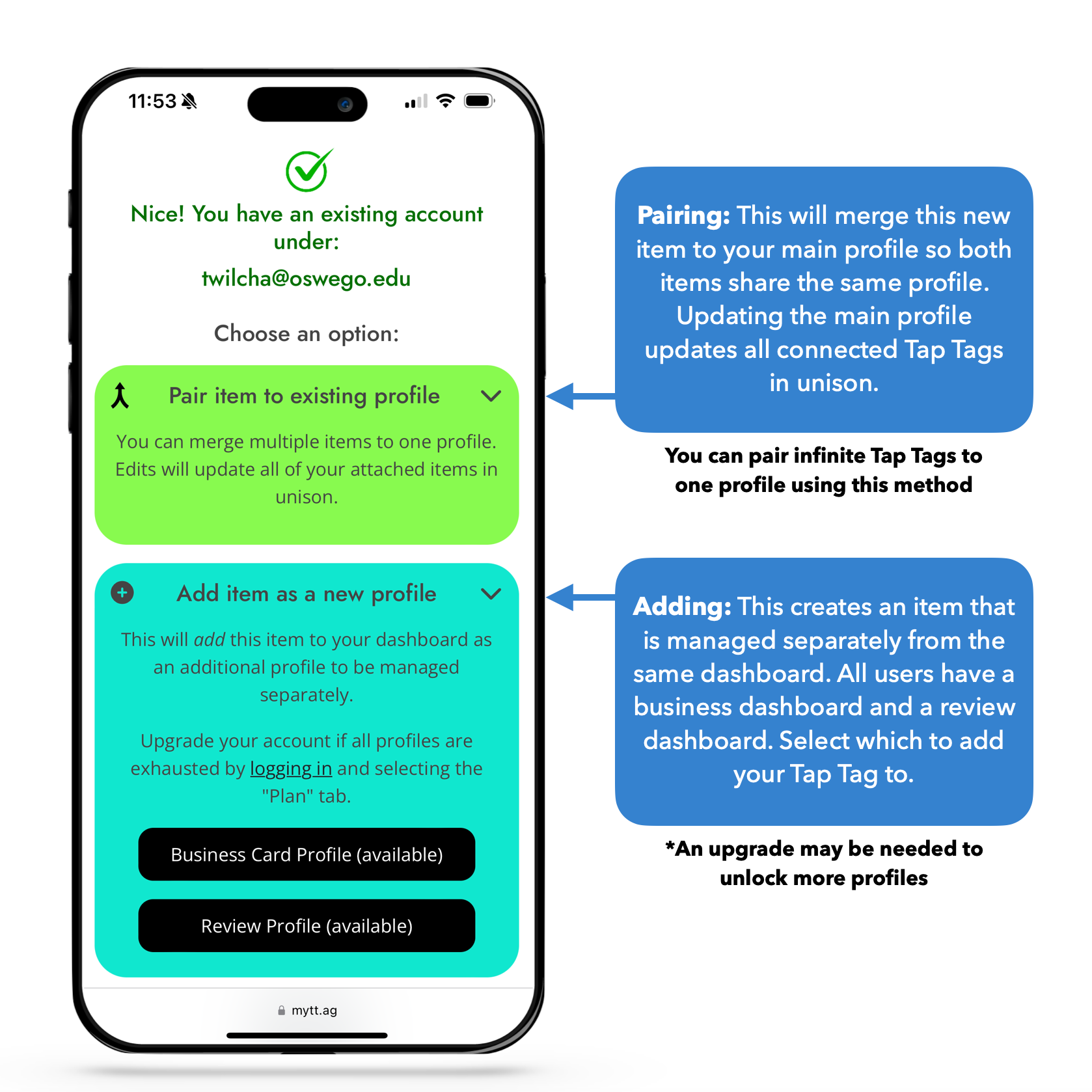 Link a new profile button: This button is found on your dashboard. Click it. Then, enter setup mode on your Tap Tag and enter the Tap Tag # found at the top of setup mode.