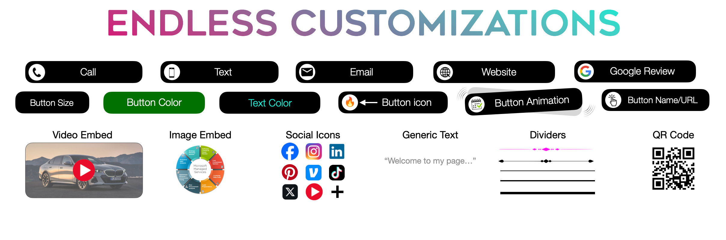 Customize all aspects of your team's profiles, or create master themes and assign them to sub-teams. Add your own branding, button animations, videos, plain text, buttons and more.