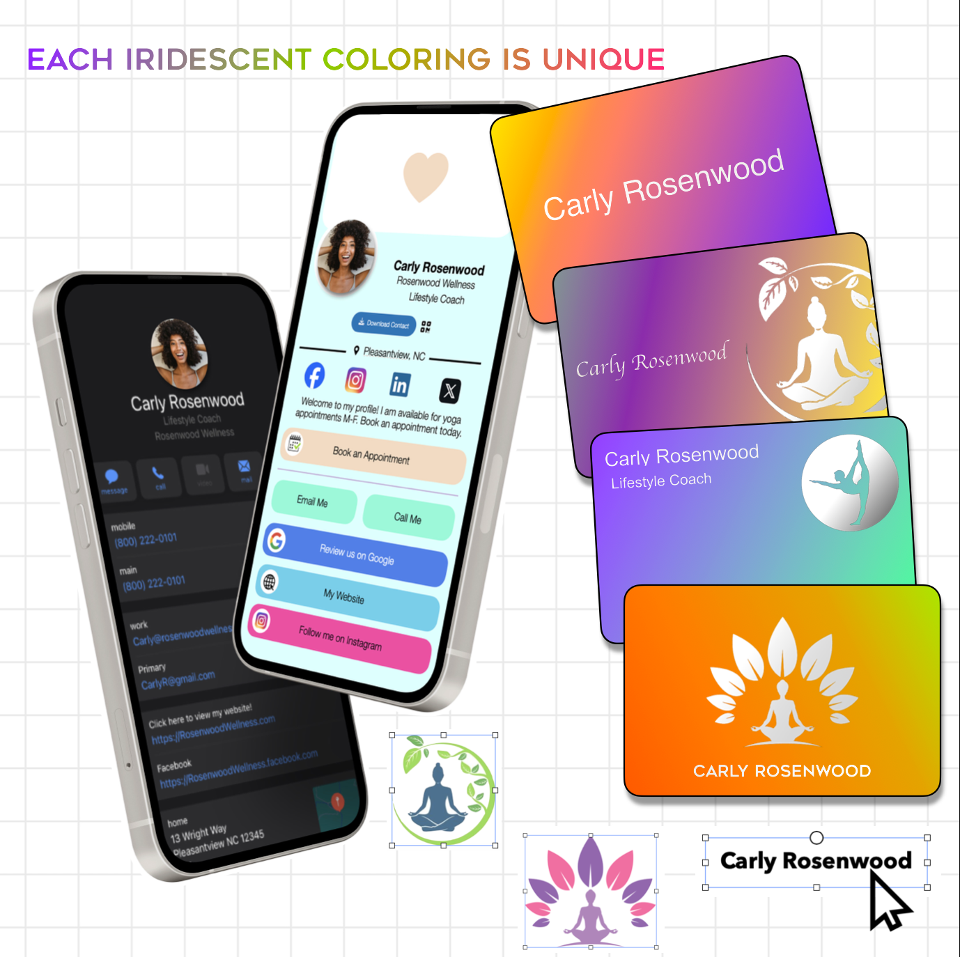 Our ultra-luxury metal NFC Business card engraves to be silver on multi-colored iridescent chrome. Each card has dynamic tap-to-share NFC chip and a matching QR code engraving included. Each card is also unique in appearance, ranging in a spectrum of purple, green, red, and yellow tints. The chip on back is embedded into the metal and a neutral gray color.
