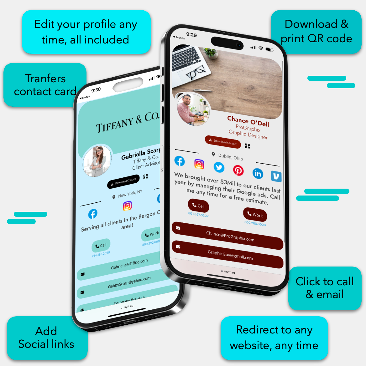 Tapping with a smartphone or scanning the QR with a camera immediately pulls up your free digital profile & contact card, any edits to your profile update both the NFC and QR in real time. Scan the QR in the image to see!
