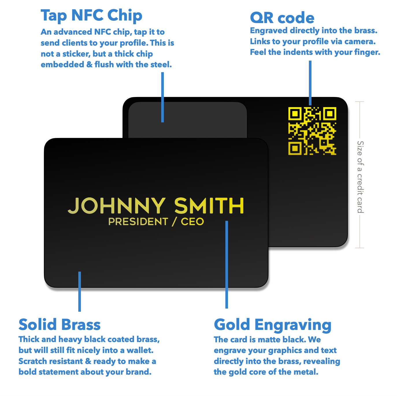 Our Premier NFC Tap Business card engraves to be gold on black and sports a dynamic tap-to-share NFC tech and a matching QR code. Made from Premium Brass and coated in a matte black protective oxide layer by an electrolytic process to make it resistant from wear and tear. Our high-end laser pulverizes through this layer to reveal the beautiful gold brass core underneath, each is customized to your name, logo, or brand.