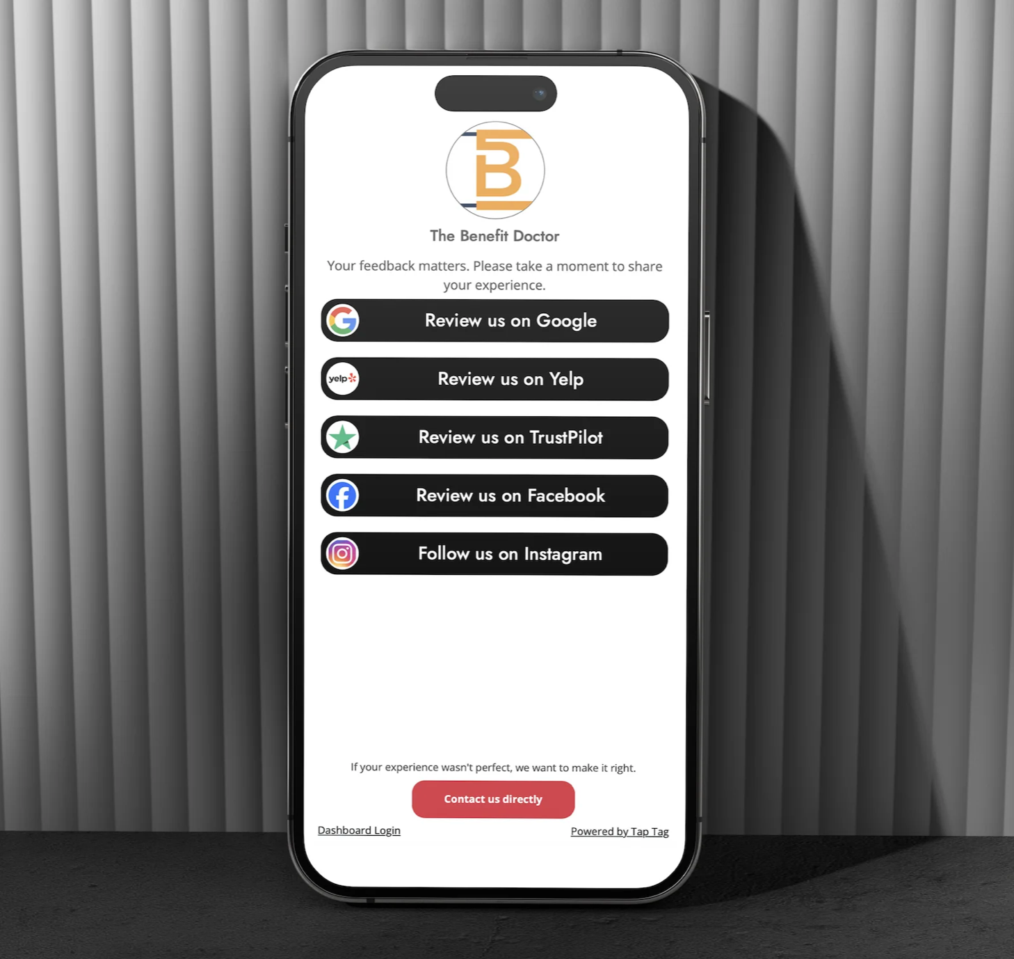 The Dynamic Tap Tags can be changed remotely from your dashboard, in addition to a few other features like printing your QR code, tech support, and an optional upgrade to Review Filtration.