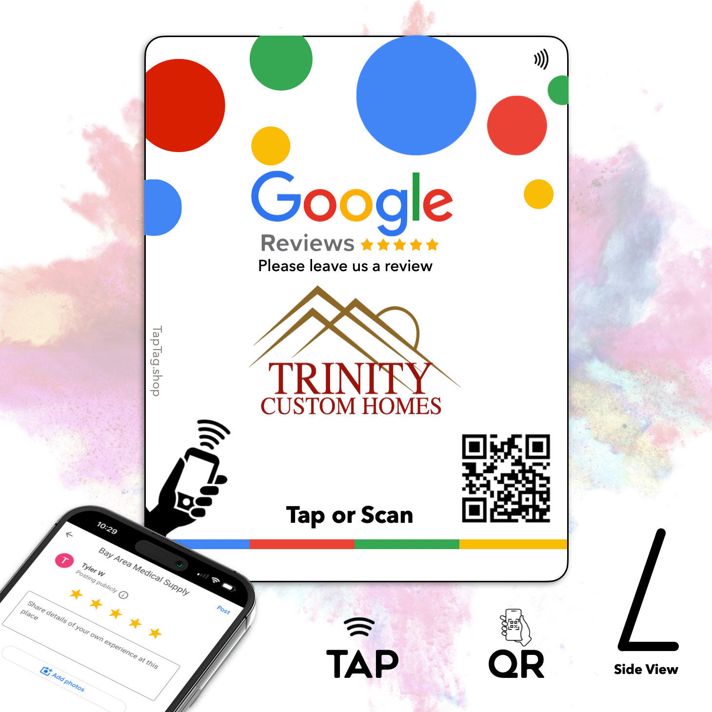 This Tap Tag standalone NFC tap sign is moveable which makes it perfect for on the go promoting. It boasts a large tap chip within and is easily scannable for reviews, contact info, payments and more. Available with an optional QR code and edge-to-edge full color customization that will easily capture attention.